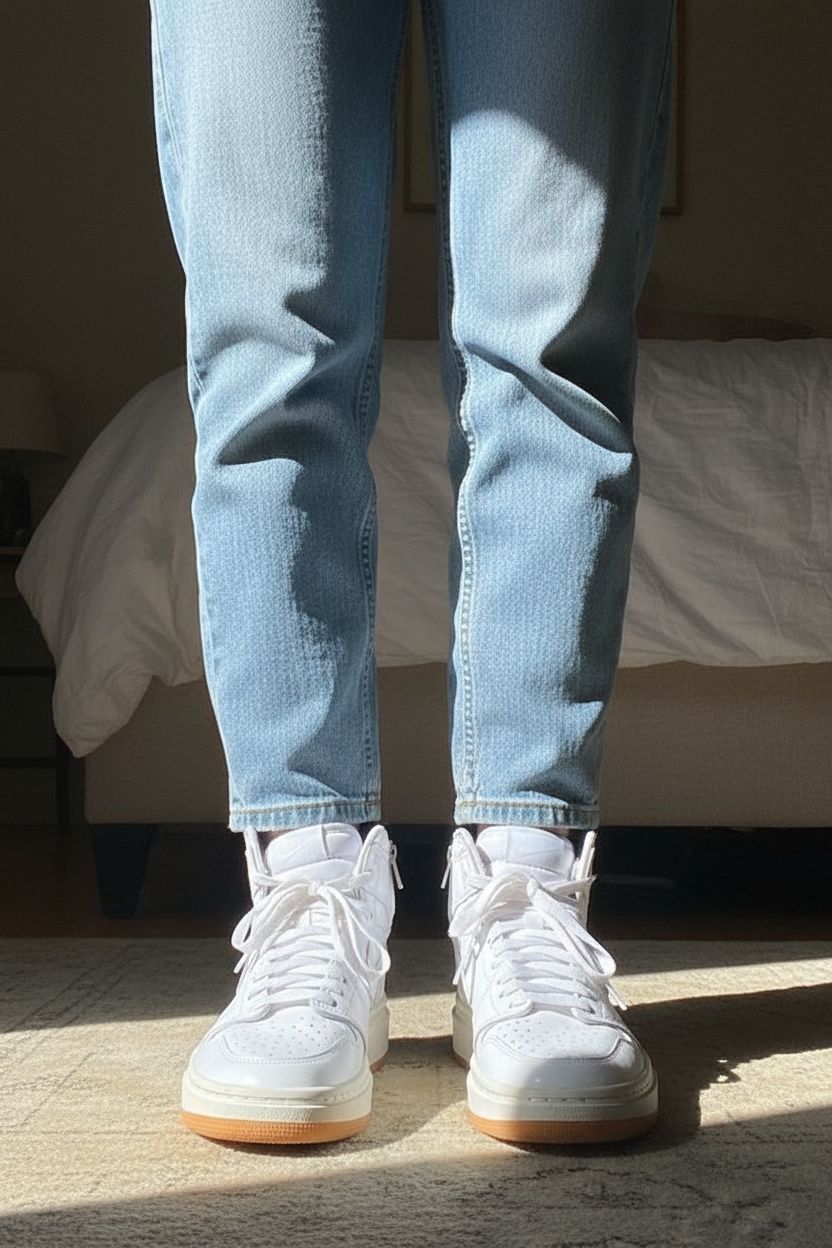 Baskets montantes Nike Air Jordan 1 élévateur high em pé, de frente para a câmera, em um quarto com iluminação suave e luz natural filtrando pela janela.