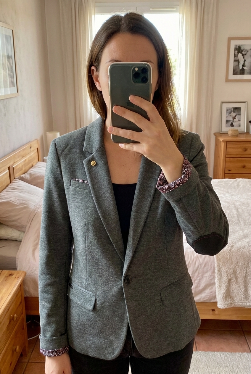Blazer gris IKKS debout, face à la caméra, dans une chambre à la lumière douce, avec une lumière naturelle filtrant par la fenêtre.