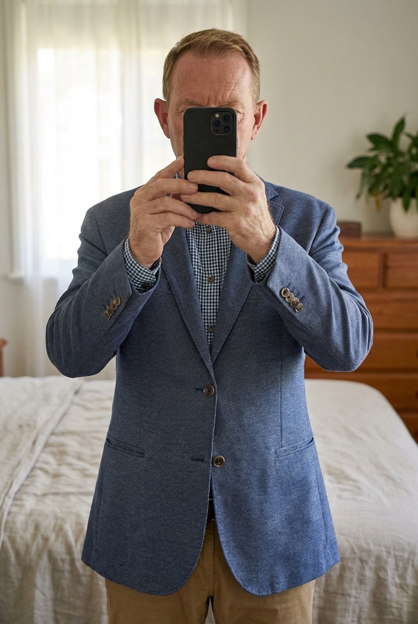 Blazer Massimo Dutti debout, face à la caméra, dans une chambre à la lumière douce, avec une lumière naturelle filtrant par la fenêtre.
