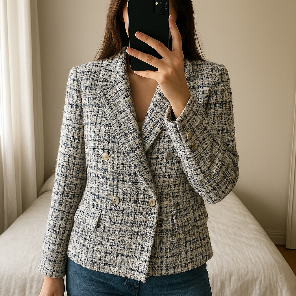 Blazer neuf debout, face à la caméra, dans une chambre à la lumière douce, avec une lumière naturelle filtrant par la fenêtre.
