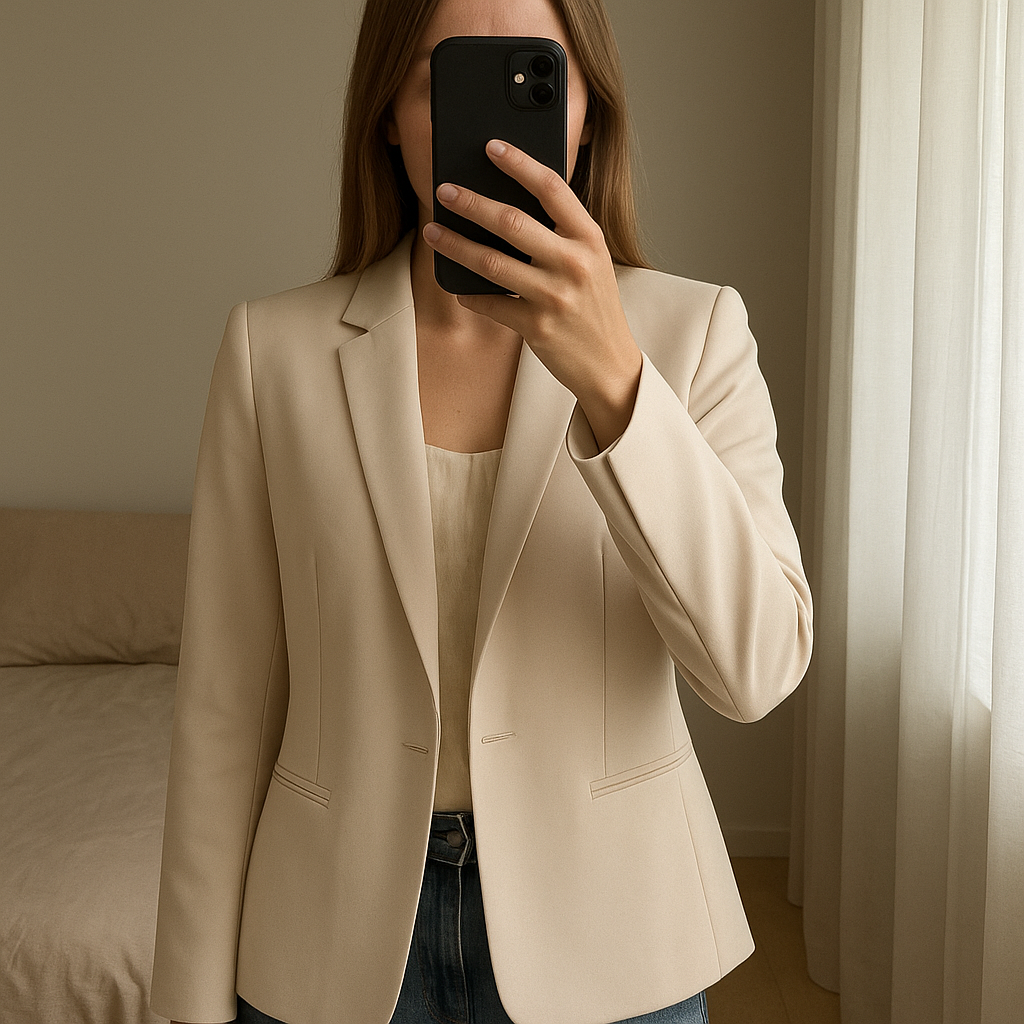 Blazer Zara T34 beige neuf debout, face à la caméra, dans une chambre à la lumière douce, avec une lumière naturelle filtrant par la fenêtre.