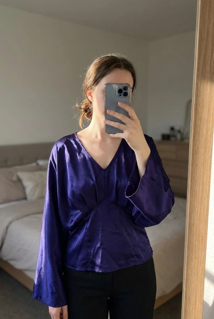 Blouse manches longues debout, face à la caméra, dans une chambre à la lumière douce, avec une lumière naturelle filtrant par la fenêtre.