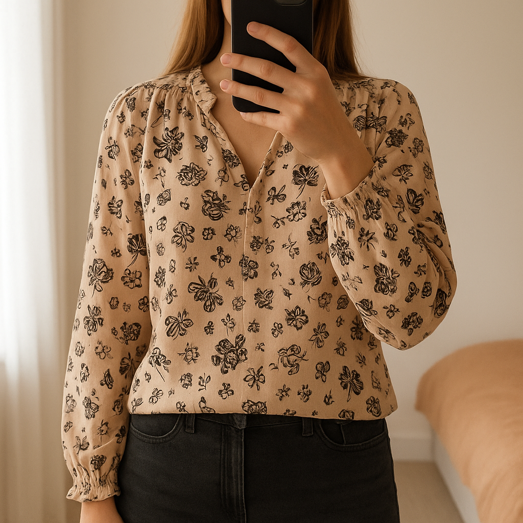 Blouse Zara Rose clair debout, face à la caméra, dans une chambre à la lumière douce, avec une lumière naturelle filtrant par la fenêtre.