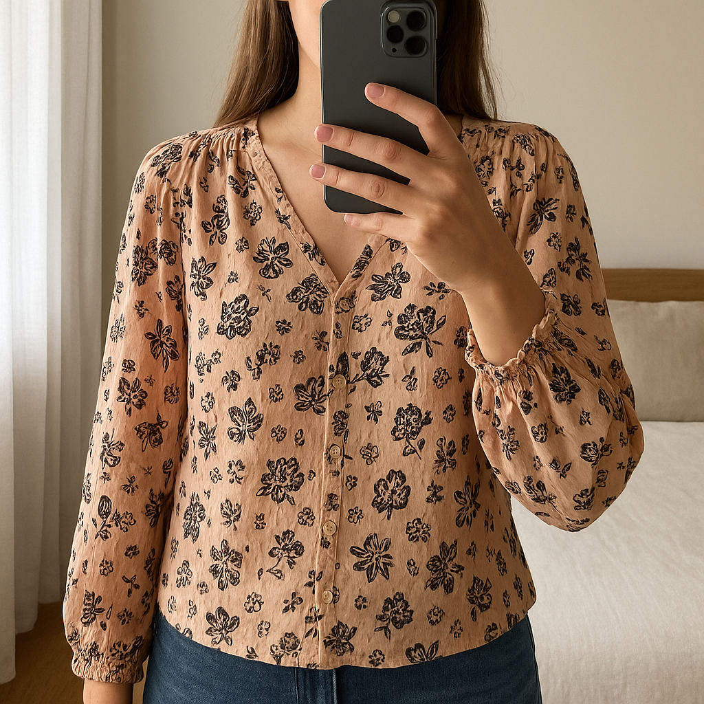 Blouse Zara T36 debout, face à la caméra, dans une chambre à la lumière douce, avec une lumière naturelle filtrant par la fenêtre.
