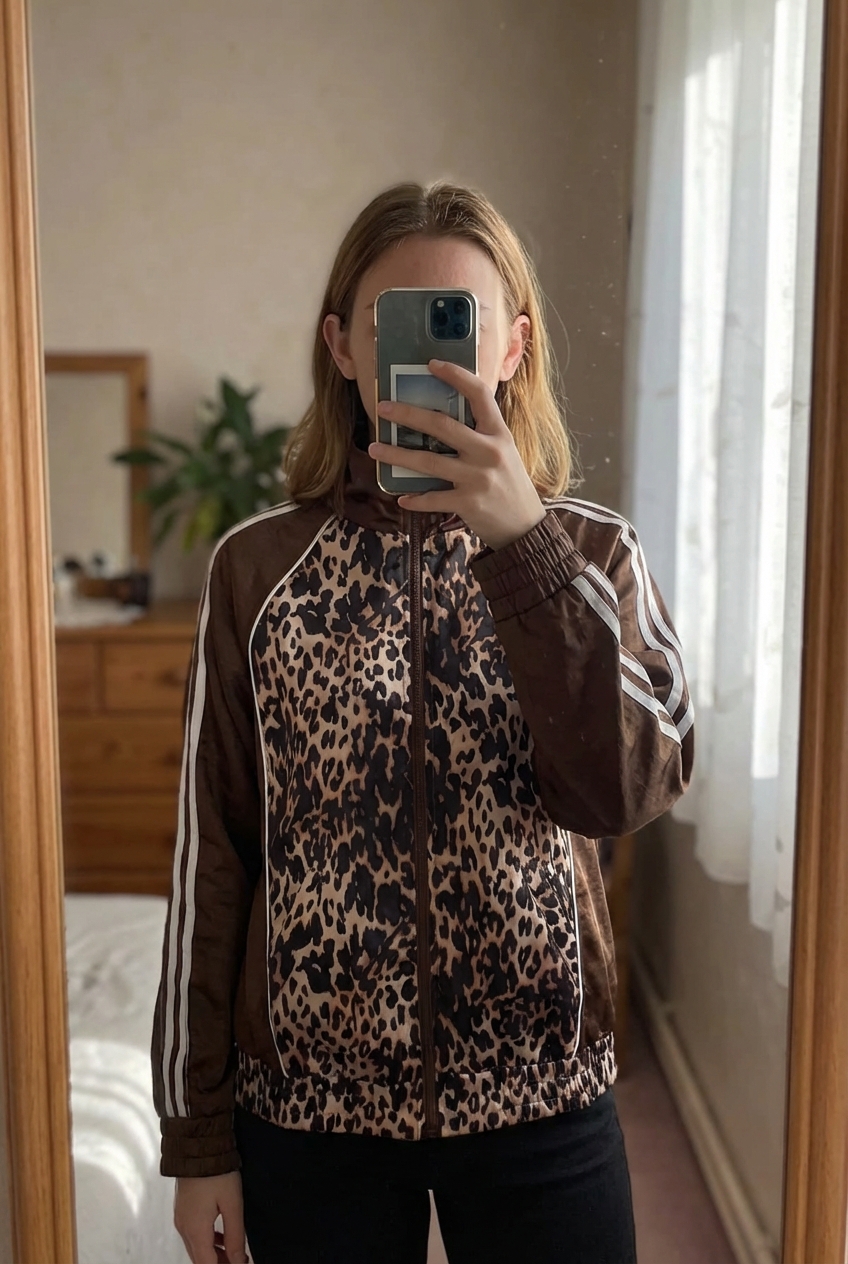Blouson léopard debout, face à la caméra, dans une chambre à la lumière douce, avec une lumière naturelle filtrant par la fenêtre.