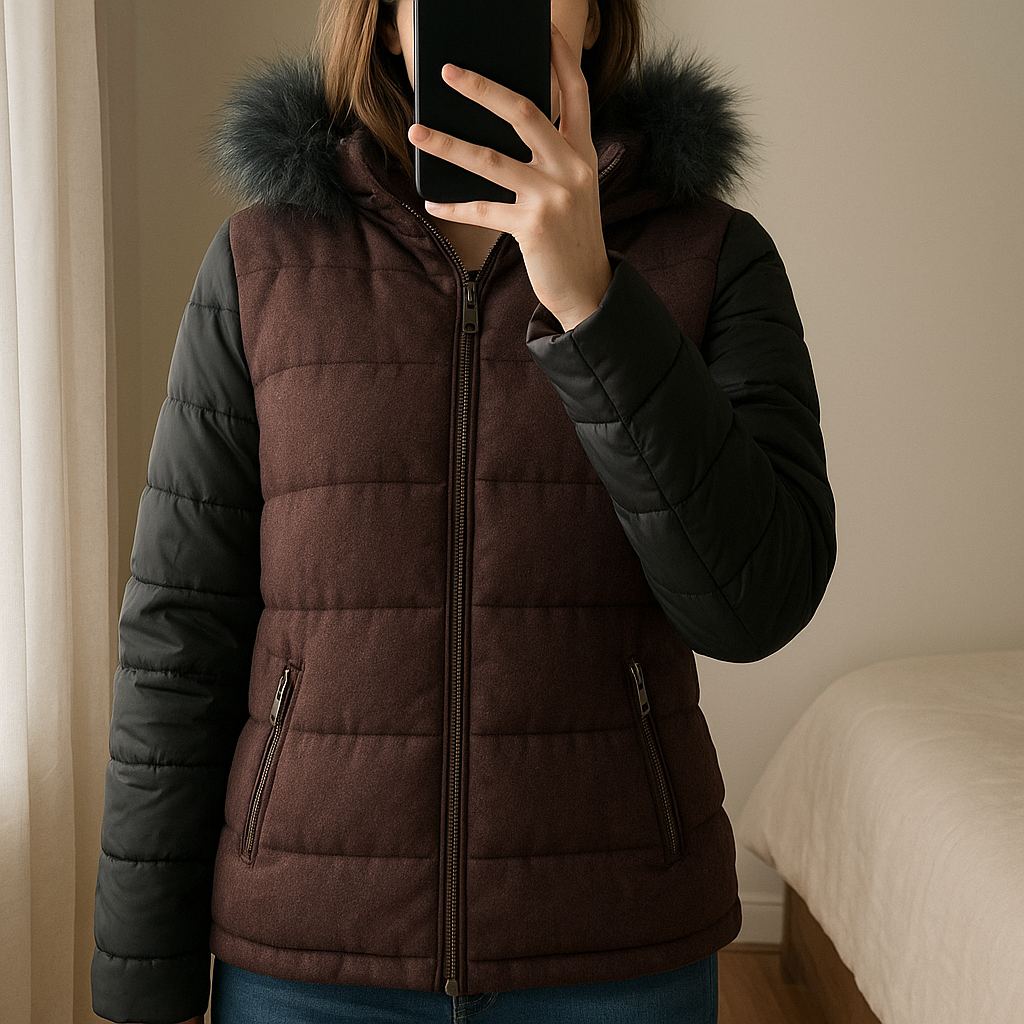 Blusão da Stradivarius em pé, de frente para a câmera, em um quarto com iluminação suave e luz natural filtrando pela janela.