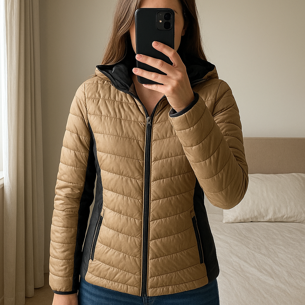Blusão de penas da Mango em pé, de frente para a câmera, em um quarto com iluminação suave e luz natural filtrando pela janela.