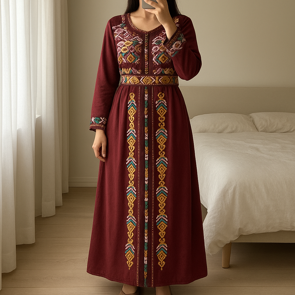 Caftan avec ceinture debout, face à la caméra, dans une chambre à la lumière douce, avec une lumière naturelle filtrant par la fenêtre.