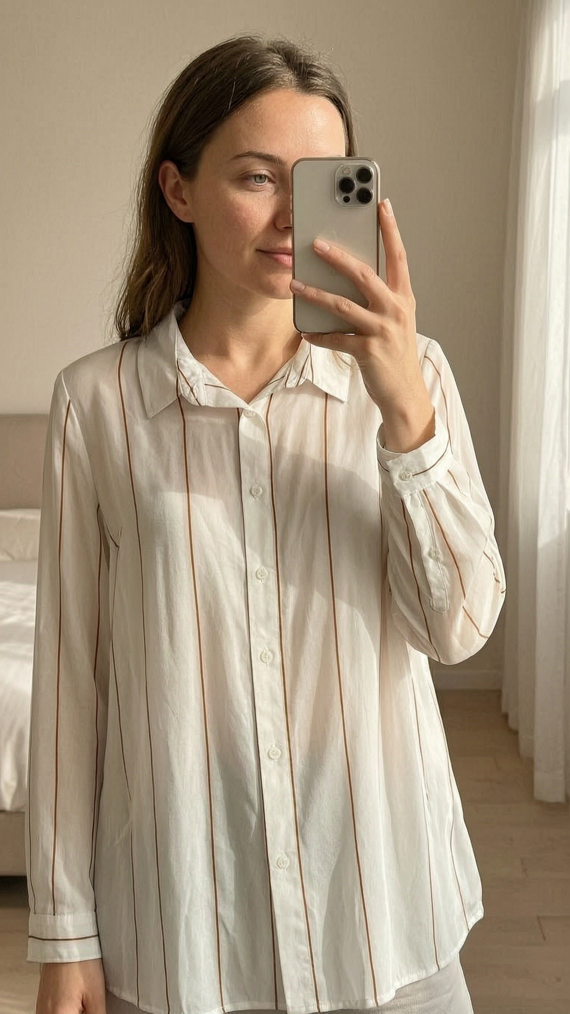 Camisa branca com riscas em pé, de frente para a câmera, em um quarto com iluminação suave e luz natural filtrando pela janela.