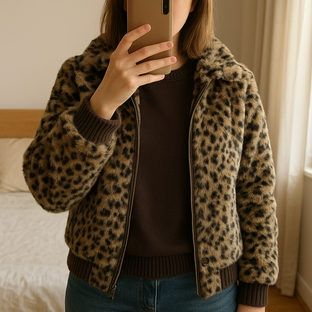 Casaco da zara em pé, de frente para a câmera, em um quarto com iluminação suave e luz natural filtrando pela janela.