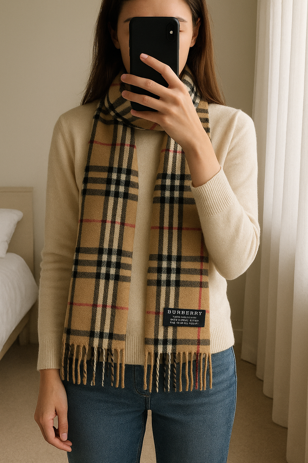 écharpe burberry beige debout, face à la caméra, dans une chambre à la lumière douce, avec une lumière naturelle filtrant par la fenêtre.