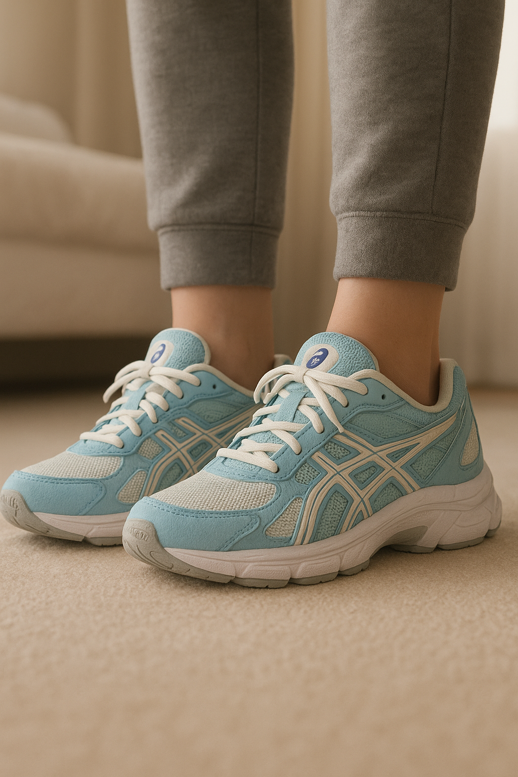Chaussures Asics GEL-NYC 👟 debout, face à la caméra, dans une chambre à la lumière douce, avec une lumière naturelle filtrant par la fenêtre.