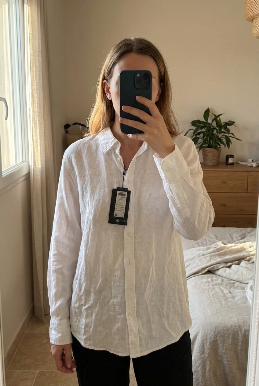 Chemise blanche Véro Moda Lin debout, face à la caméra, dans une chambre à la lumière douce, avec une lumière naturelle filtrant par la fenêtre.