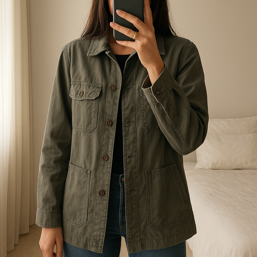 Chemise en jean vintage debout, face à la caméra, dans une chambre à la lumière douce, avec une lumière naturelle filtrant par la fenêtre.
