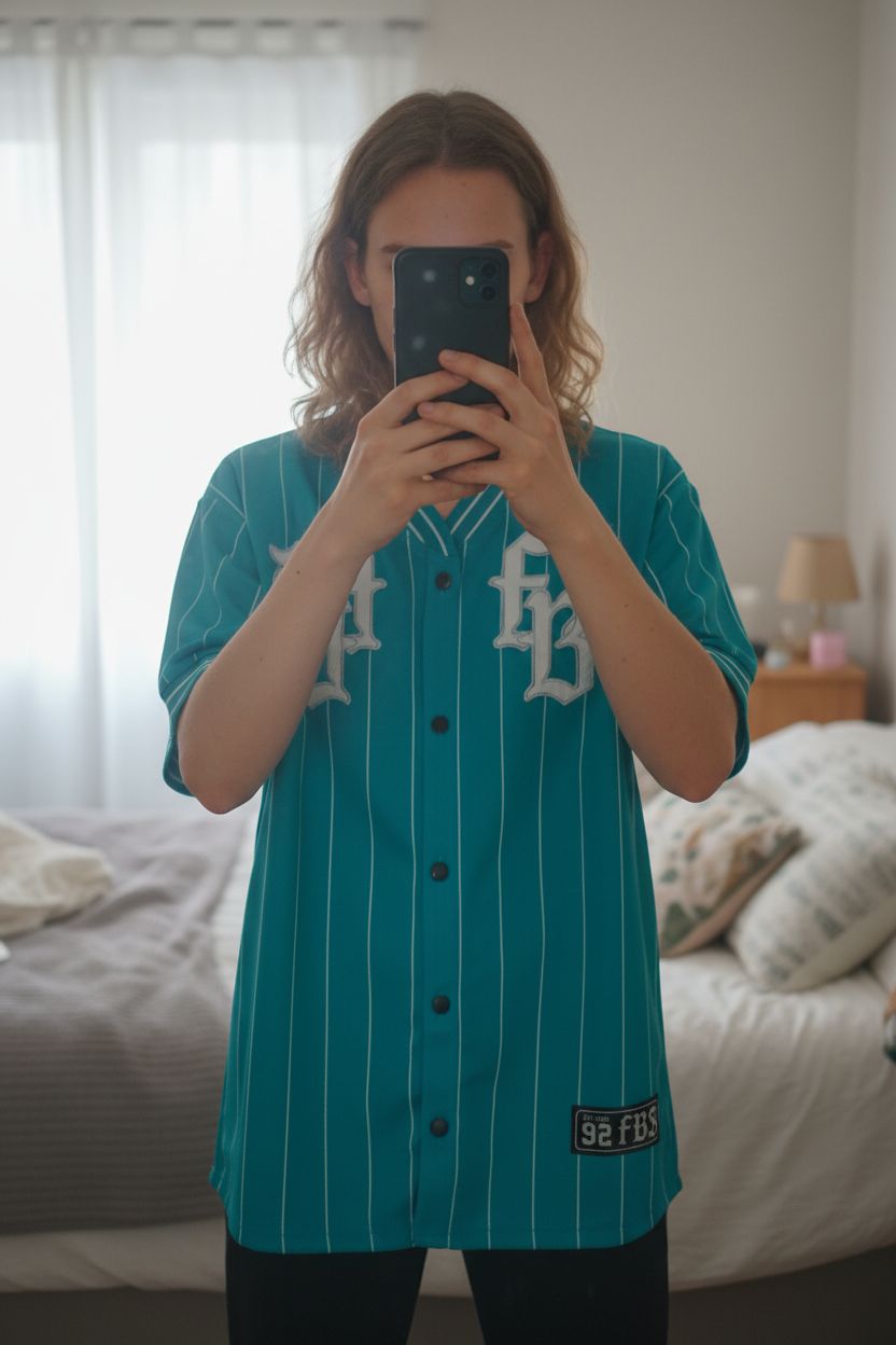 Chemise rayée base-ball turquoise blazer teddy oversized New Yorker taille XXS XS debout, face à la caméra, dans une chambre à la lumière douce, avec une lumière naturelle filtrant par la fenêtre.