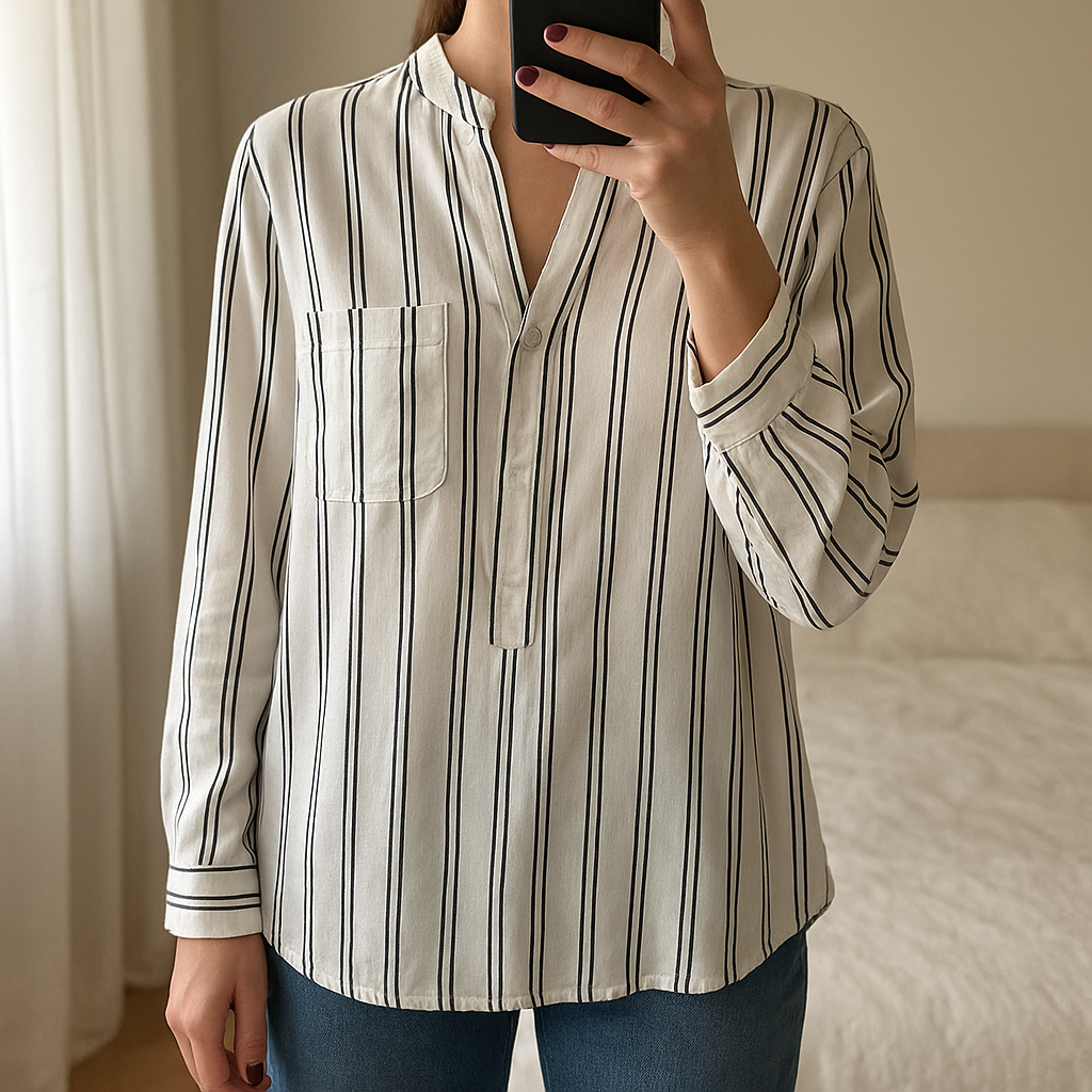 Chemise à rayures debout, face à la caméra, dans une chambre à la lumière douce, avec une lumière naturelle filtrant par la fenêtre.