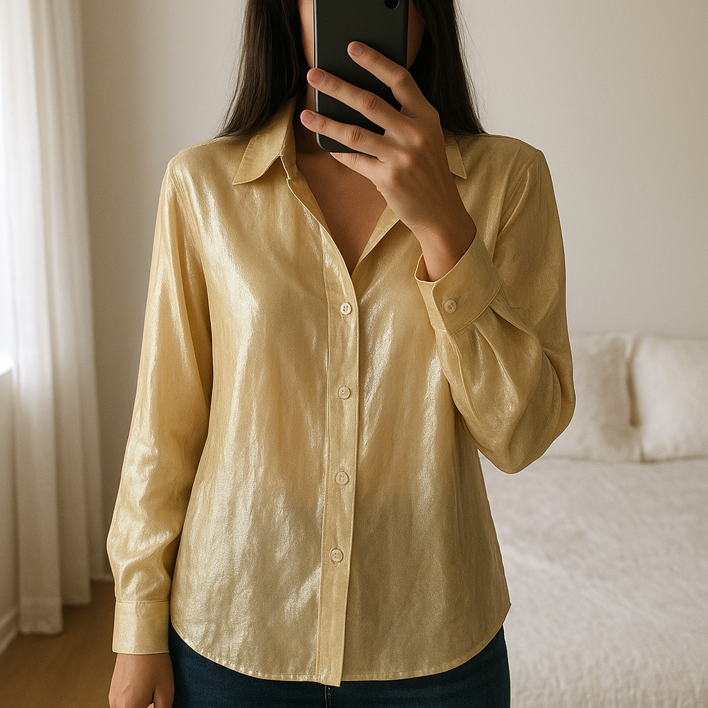 Chemise Zara debout, face à la caméra, dans une chambre à la lumière douce, avec une lumière naturelle filtrant par la fenêtre.