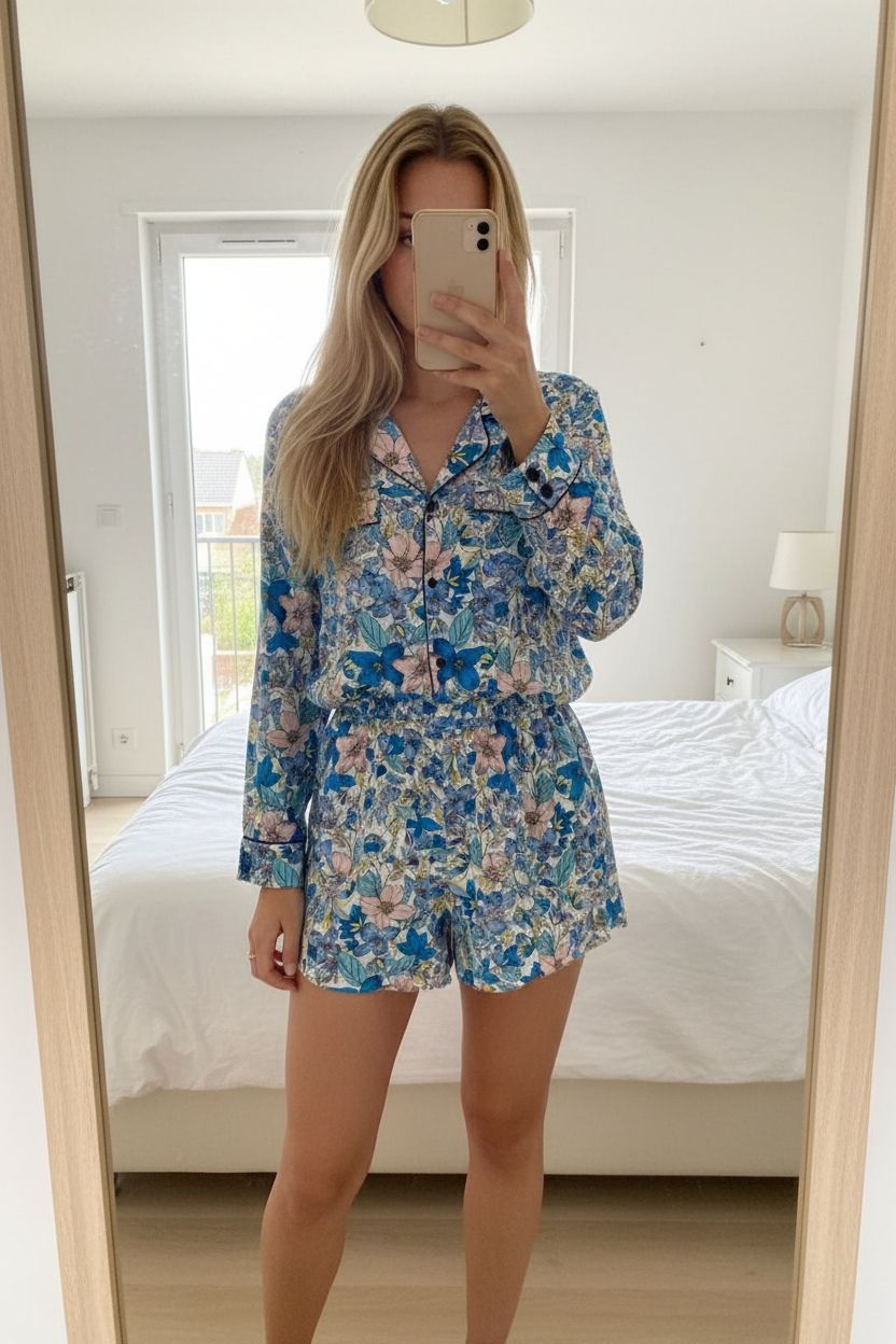Combishort bleue Sinéquanone em pé, de frente para a câmera, em um quarto com iluminação suave e luz natural filtrando pela janela.