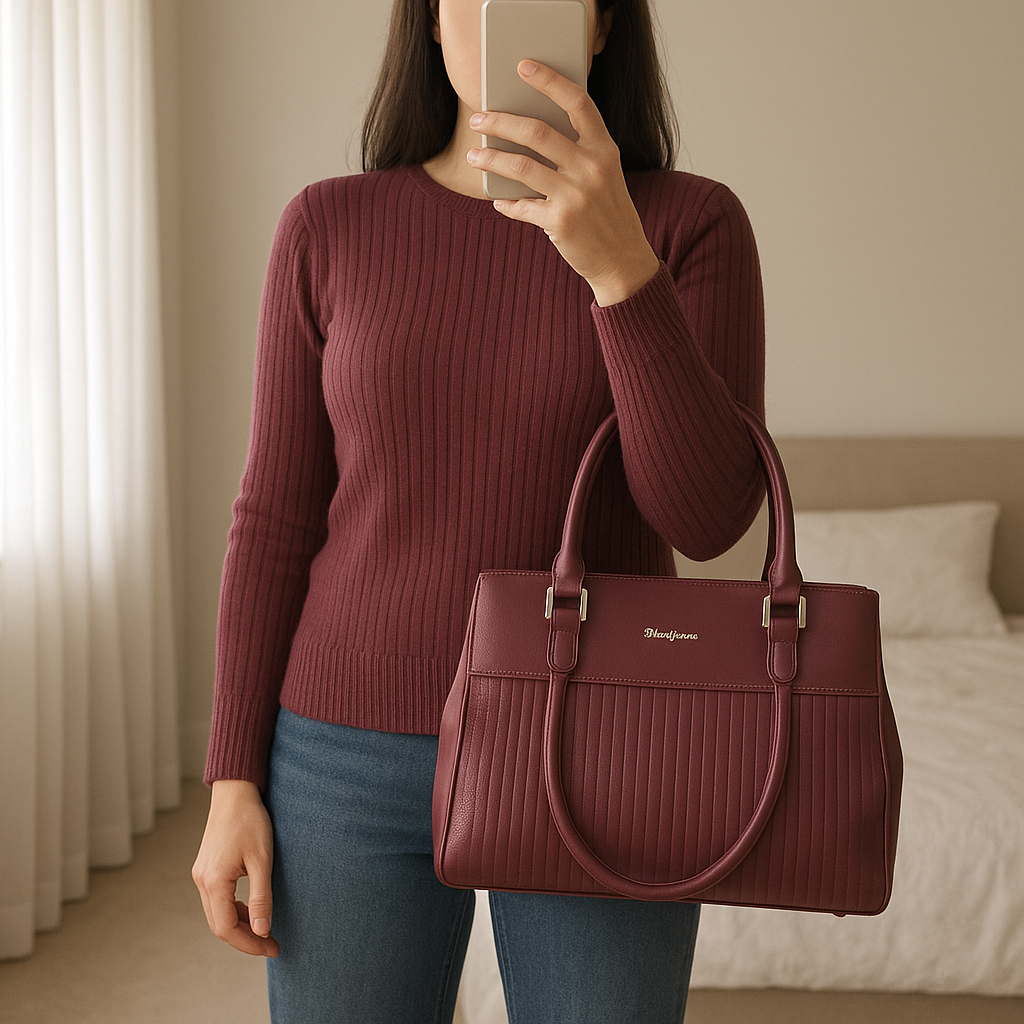 David jones handbag. standing straight facing the camera, in a softly lit bedroom setting, with gentle natural light filtering through a window.
