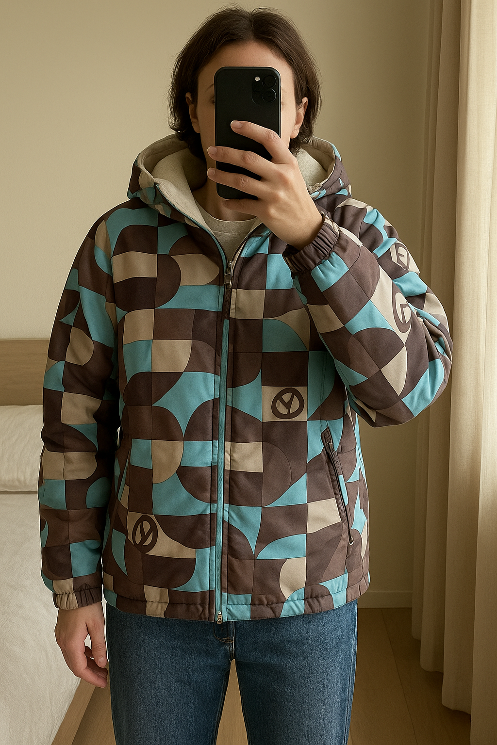 Doudoune bien chaude avec capuche debout, face à la caméra, dans une chambre à la lumière douce, avec une lumière naturelle filtrant par la fenêtre.