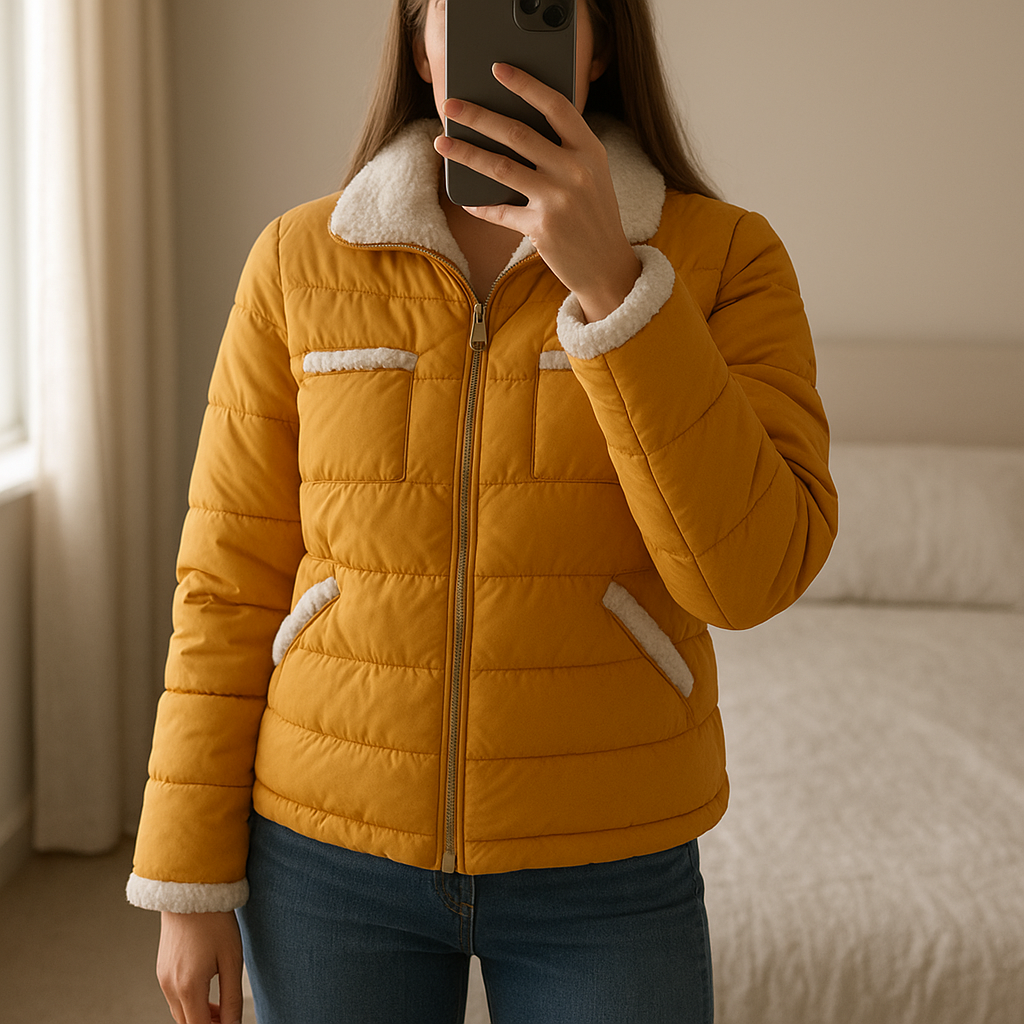 Doudoune homme taille 44 debout, face à la caméra, dans une chambre à la lumière douce, avec une lumière naturelle filtrant par la fenêtre.