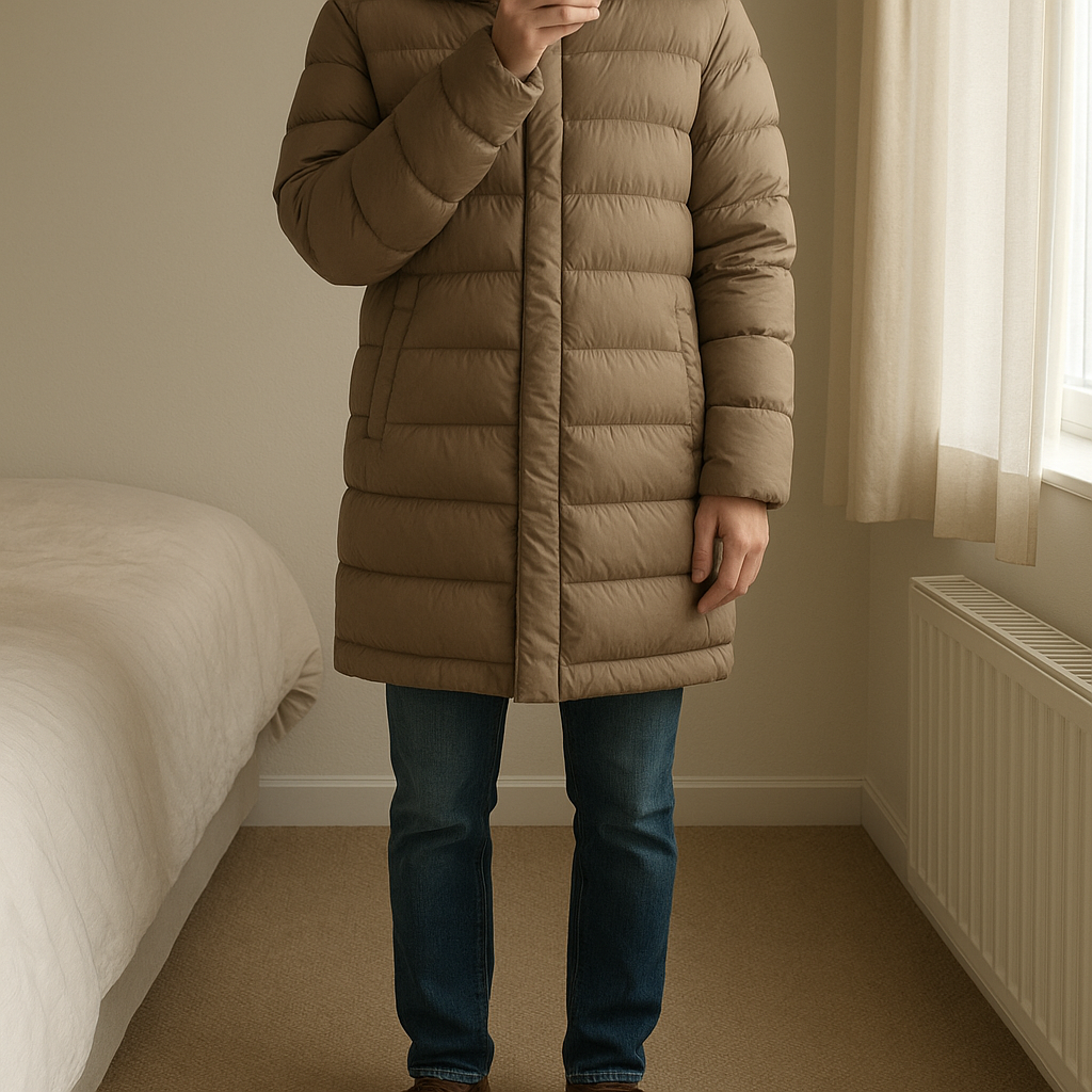 Doudoune mi longue debout, face à la caméra, dans une chambre à la lumière douce, avec une lumière naturelle filtrant par la fenêtre.