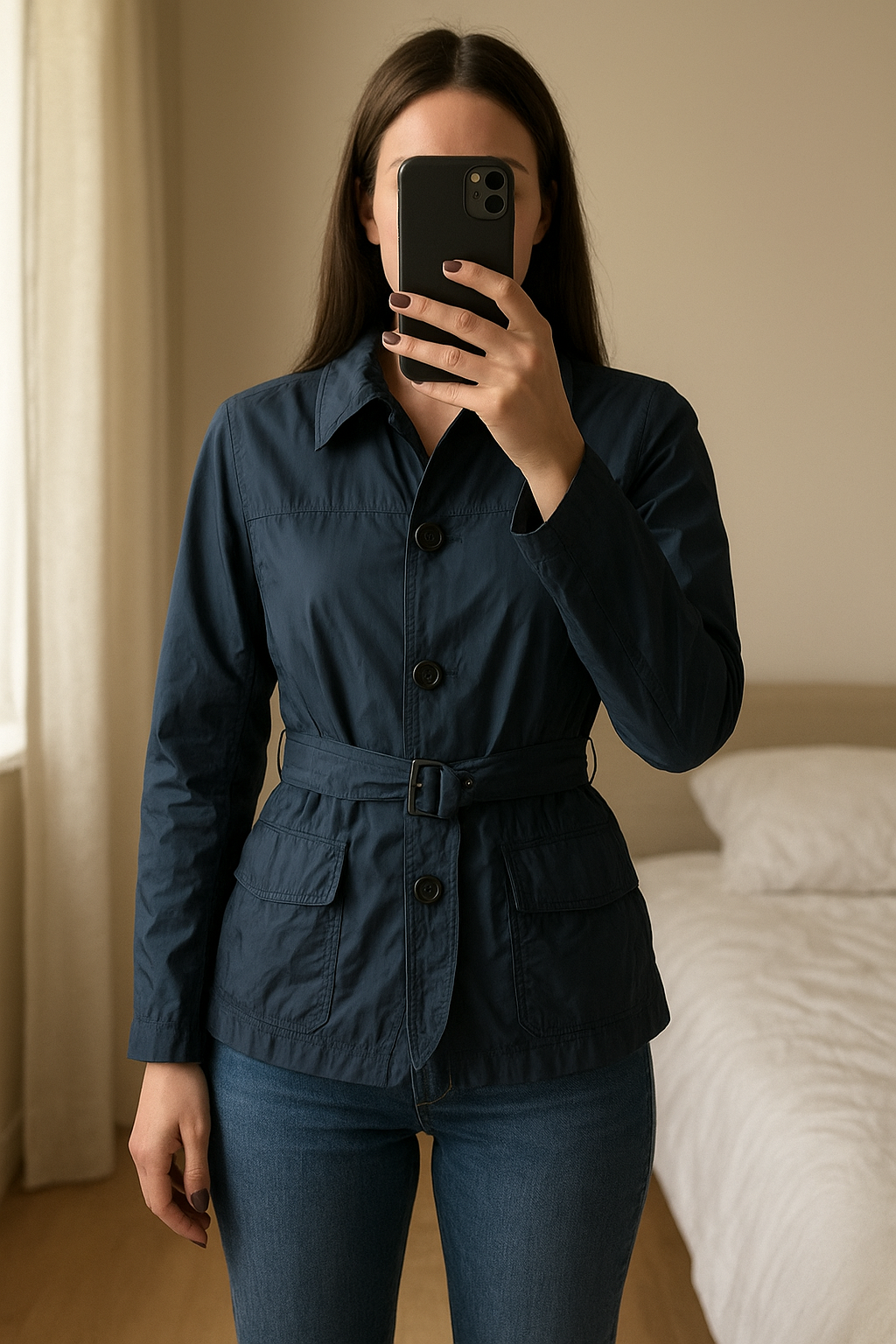 Giacca blu con cintura in piedi, rivolto verso la fotocamera, in una camera da letto con luce soffusa e luce naturale che filtra dalla finestra.