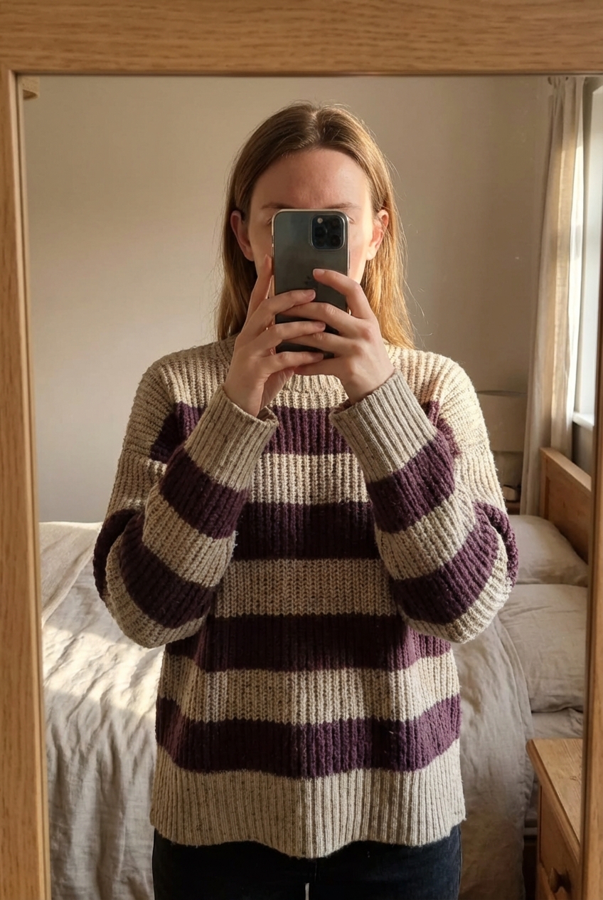 Gros Pull chaud pull&bear debout, face à la caméra, dans une chambre à la lumière douce, avec une lumière naturelle filtrant par la fenêtre.