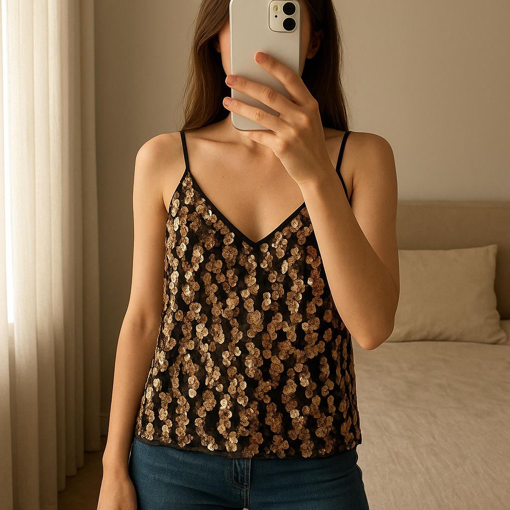Haut à sequins dorée debout, face à la caméra, dans une chambre à la lumière douce, avec une lumière naturelle filtrant par la fenêtre.