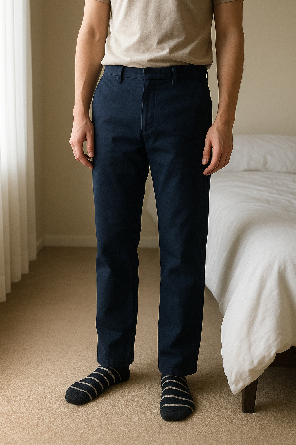 Jean zara debout, face à la caméra, dans une chambre à la lumière douce, avec une lumière naturelle filtrant par la fenêtre.