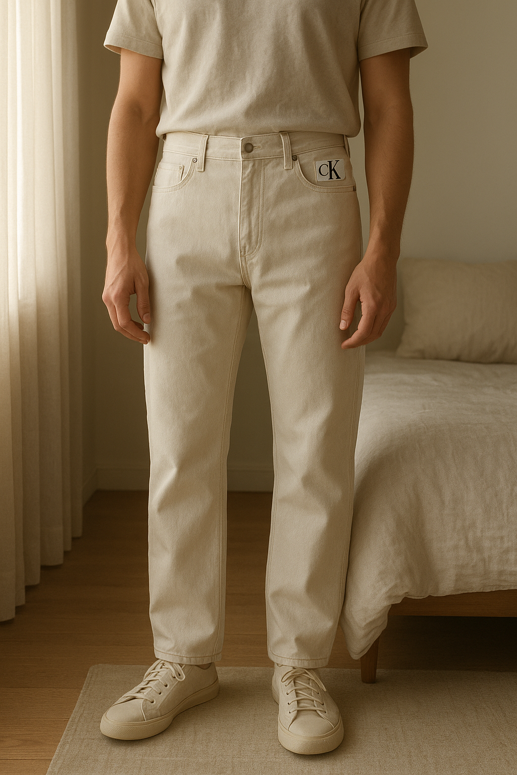 Jeans calvin Klein debout, face à la caméra, dans une chambre à la lumière douce, avec une lumière naturelle filtrant par la fenêtre.