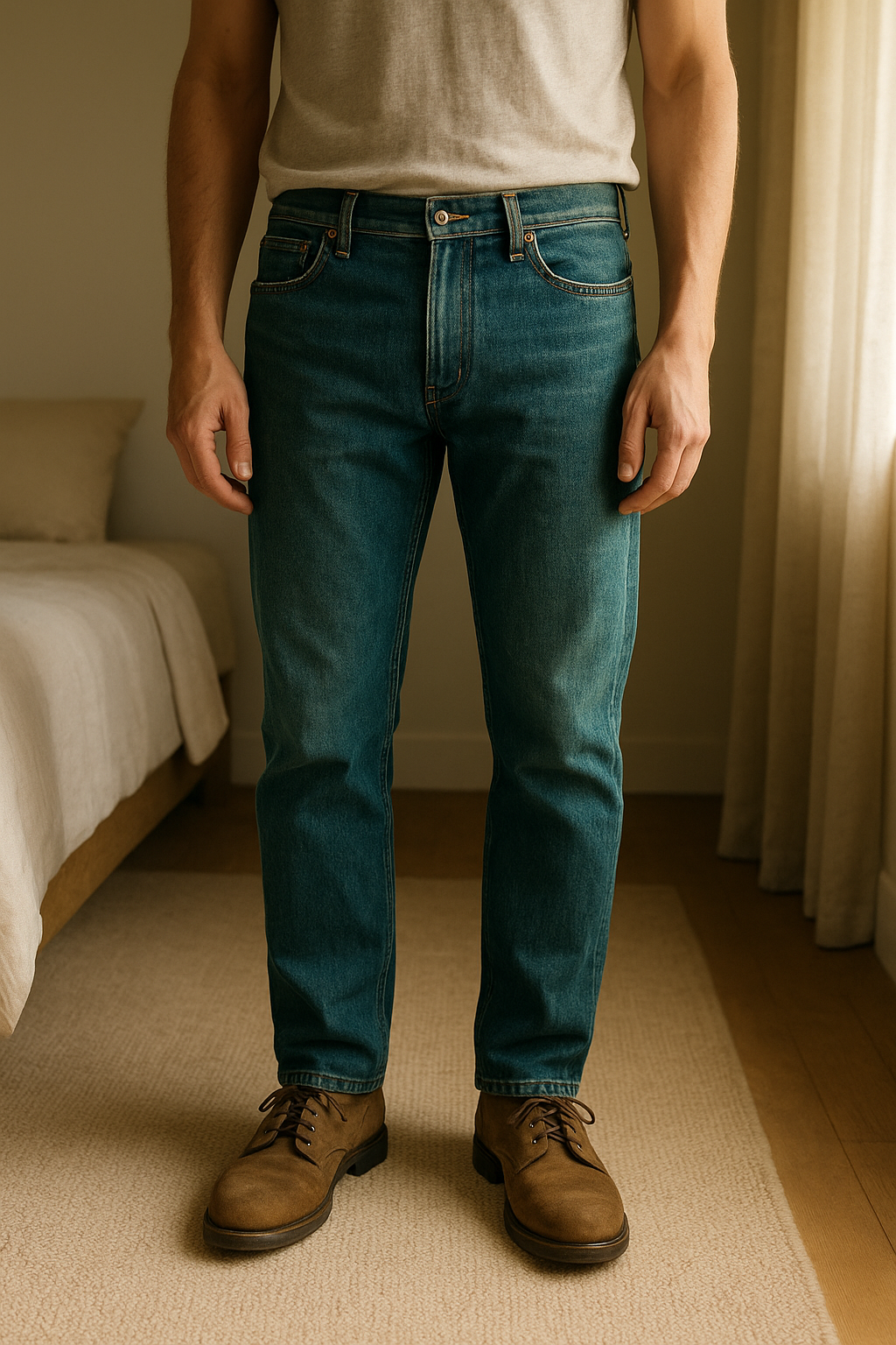 Jeans OWK taille 42 debout, face à la caméra, dans une chambre à la lumière douce, avec une lumière naturelle filtrant par la fenêtre.