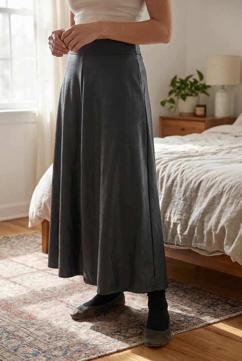 Jupe amples debout, face à la caméra, dans une chambre à la lumière douce, avec une lumière naturelle filtrant par la fenêtre.
