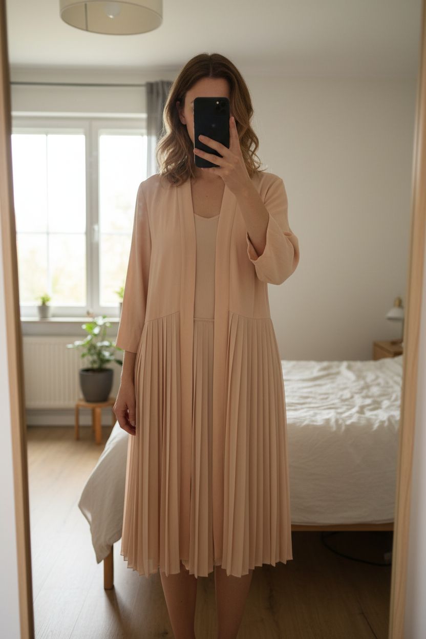 Kimono couleur pêche Zara em pé, de frente para a câmera, em um quarto com iluminação suave e luz natural filtrando pela janela.