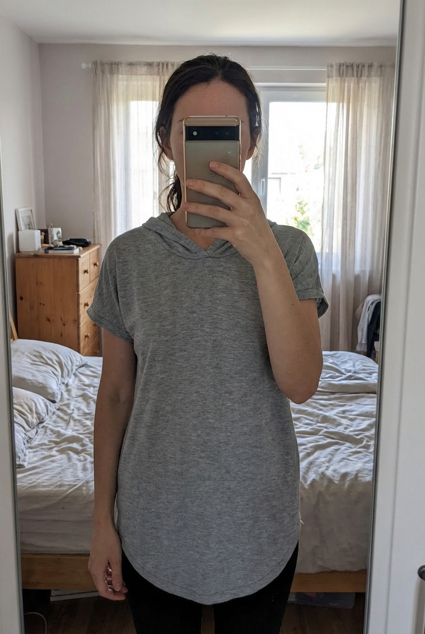 Lässiges T Shirt Kleid mit Kapuze | Gr. S aufrecht stehend, der Kamera zugewandt, in einem sanft beleuchteten Schlafzimmer, mit natürlichem Licht, das durch ein Fenster fällt.
