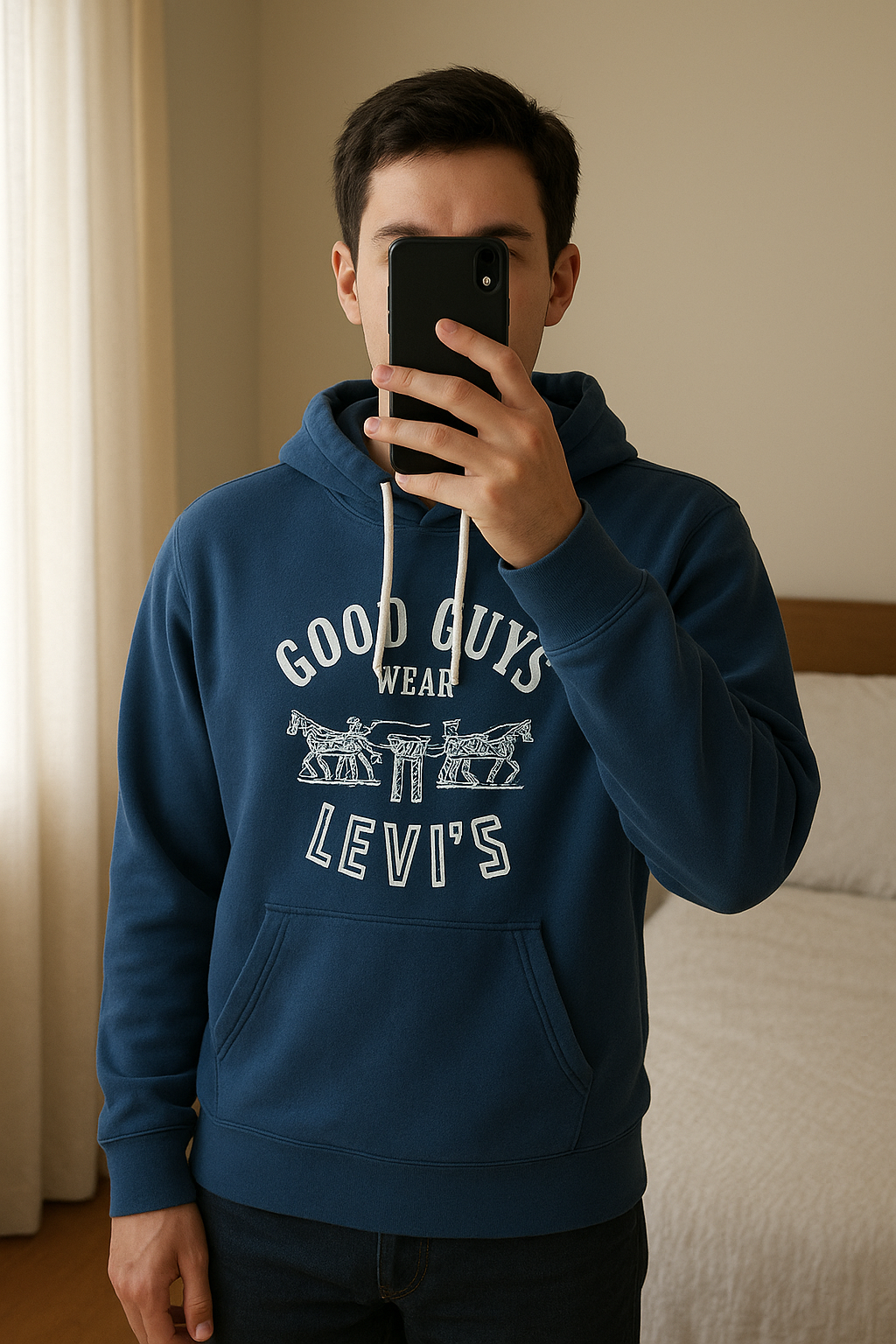 Levis hoodie em pé, de frente para a câmera, em um quarto com iluminação suave e luz natural filtrando pela janela.