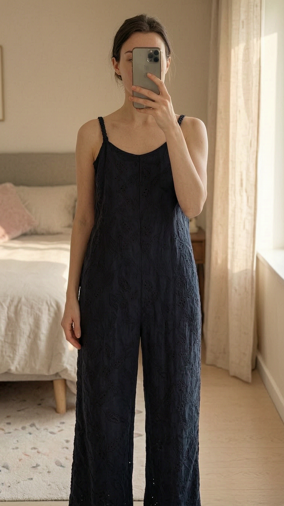 Macacão Chicca em pé, de frente para a câmera, em um quarto com iluminação suave e luz natural filtrando pela janela.