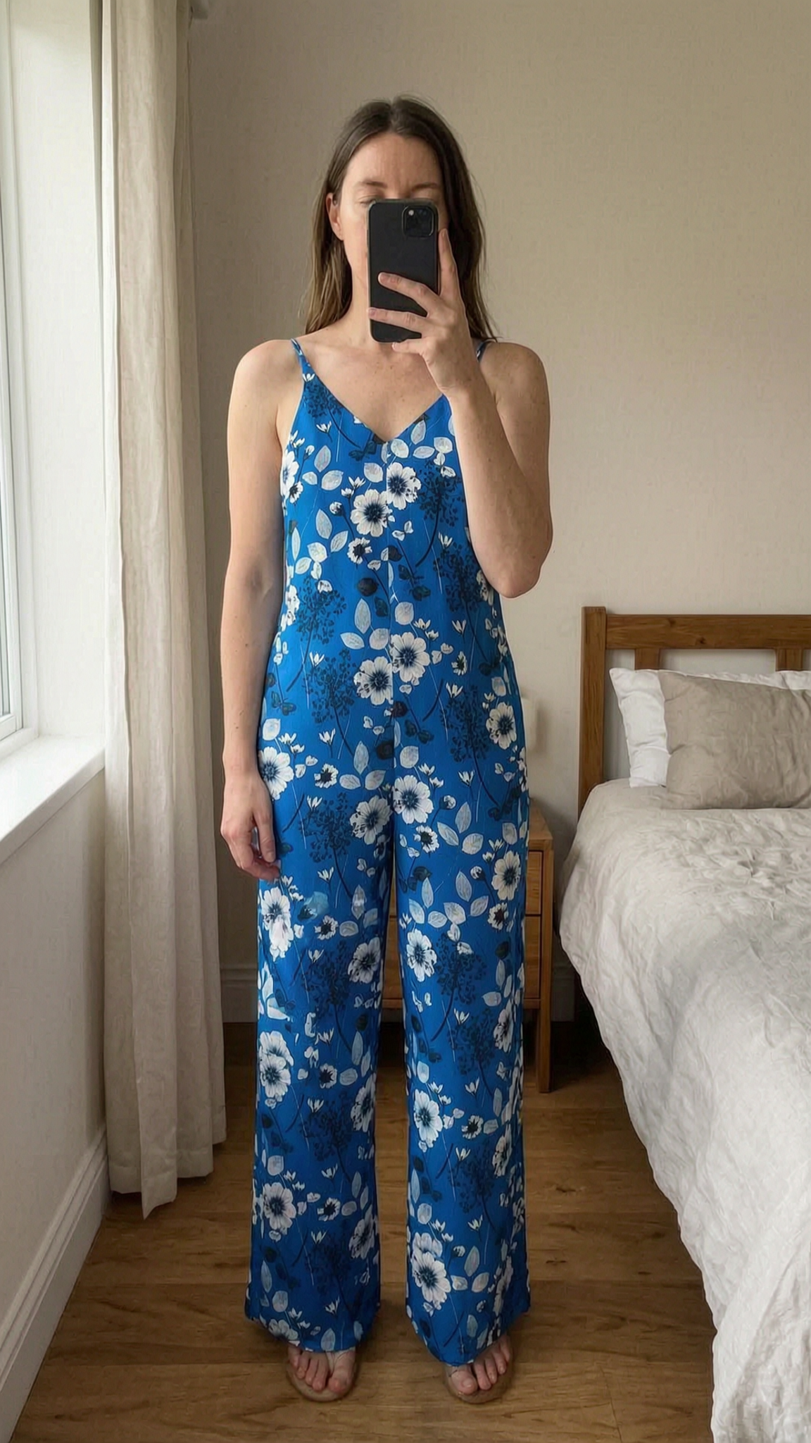 Macacão Mango Suit em pé, de frente para a câmera, em um quarto com iluminação suave e luz natural filtrando pela janela.