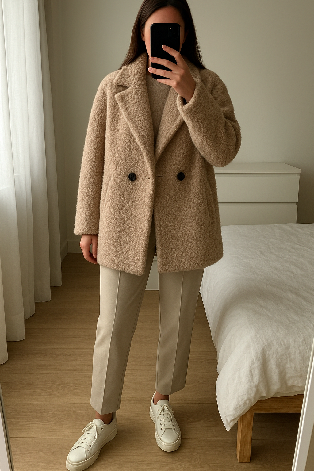 Manteau Bershka debout, face à la caméra, dans une chambre à la lumière douce, avec une lumière naturelle filtrant par la fenêtre.