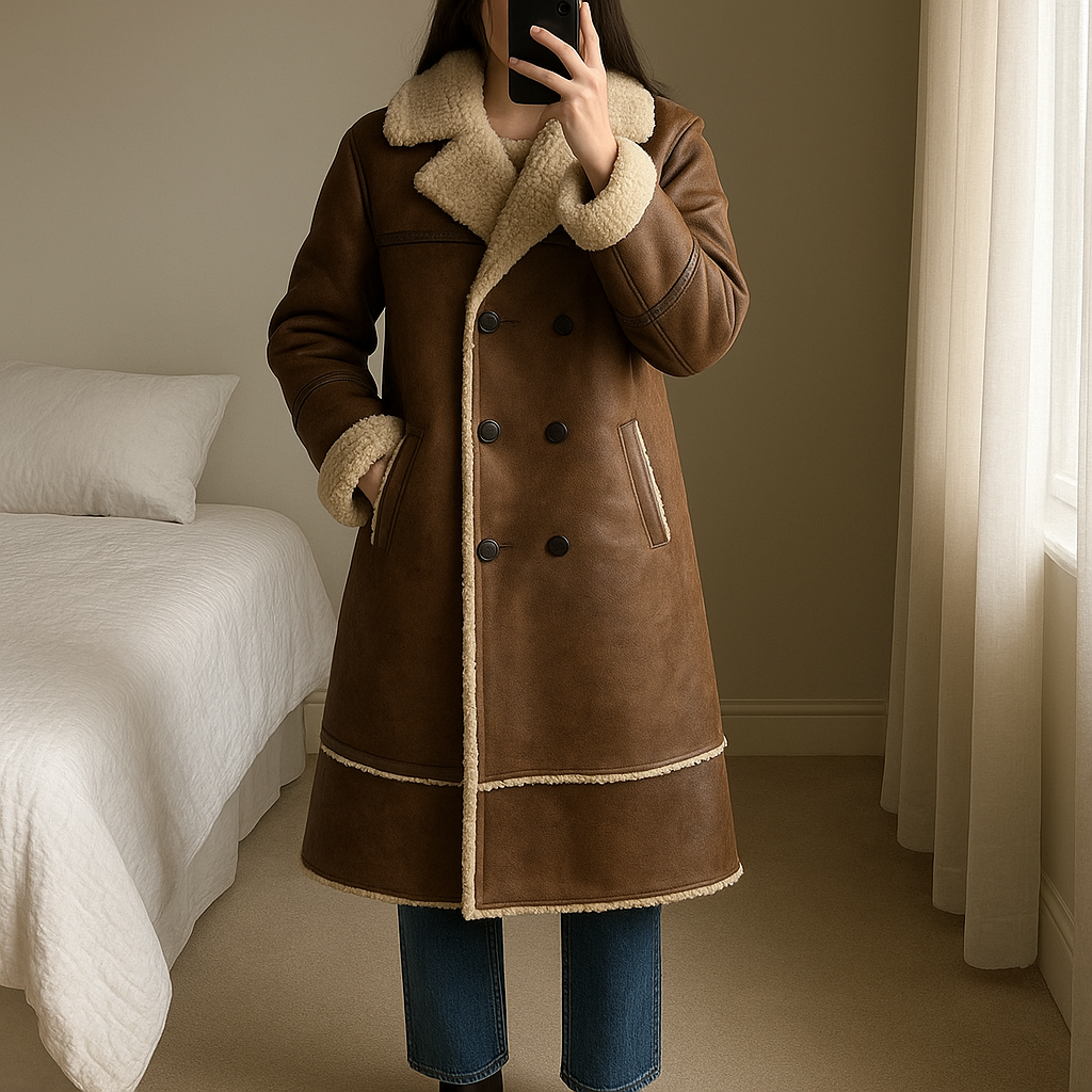 Manteau d’hiver debout, face à la caméra, dans une chambre à la lumière douce, avec une lumière naturelle filtrant par la fenêtre.