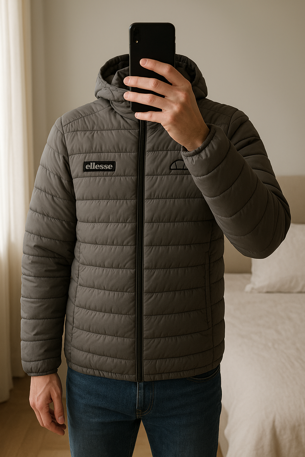 Manteau ellesse debout, face à la caméra, dans une chambre à la lumière douce, avec une lumière naturelle filtrant par la fenêtre.