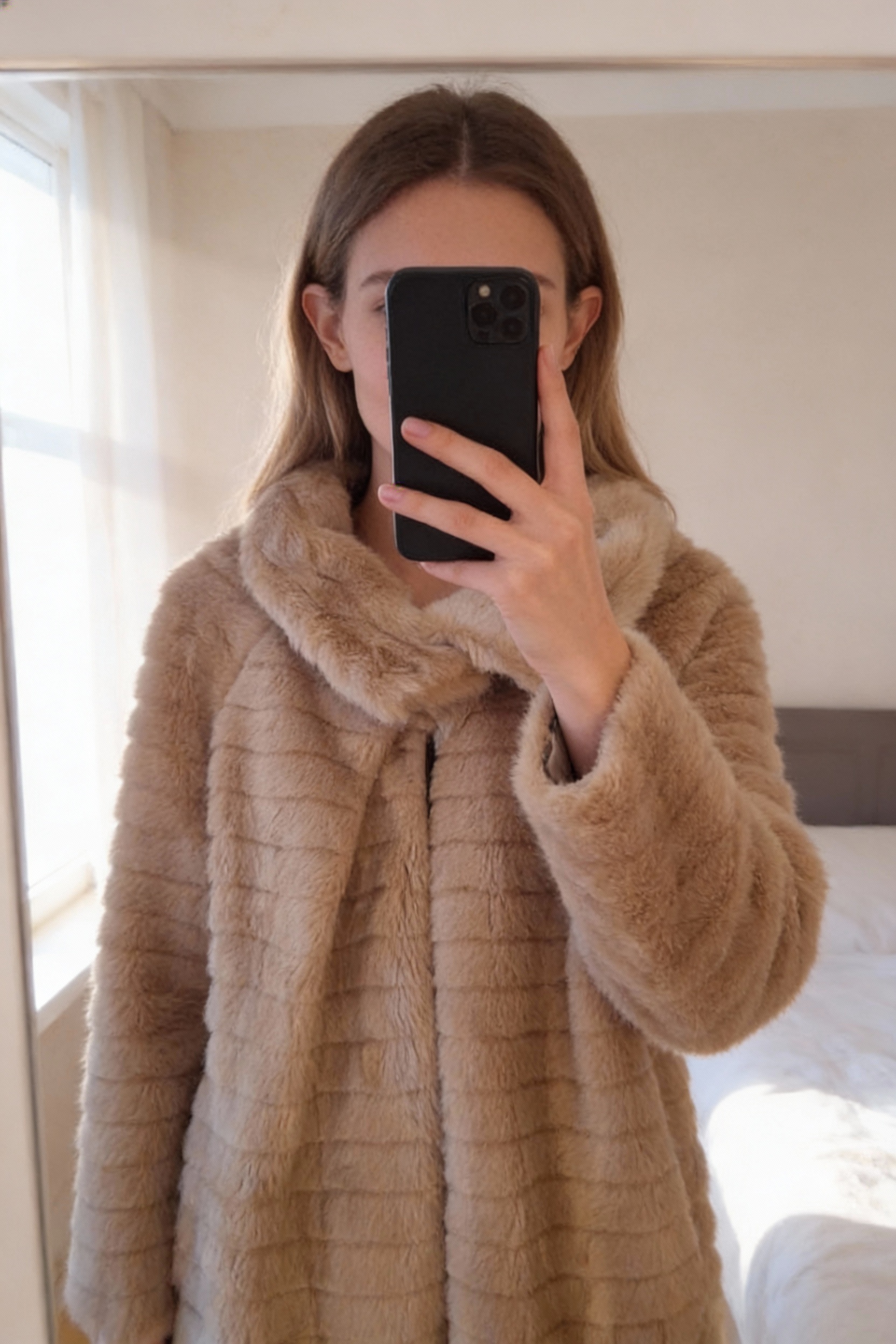 Manteau façon fourrure beige t44 debout, face à la caméra, dans une chambre à la lumière douce, avec une lumière naturelle filtrant par la fenêtre.