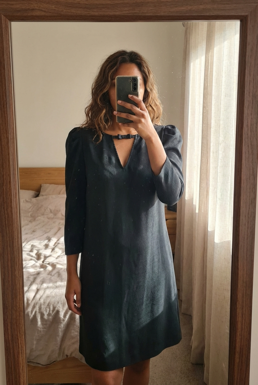 Une personne en Naf Naf Robe noir T38 debout, face à la caméra, dans une chambre à la lumière douce, avec une lumière naturelle filtrant par la fenêtre.