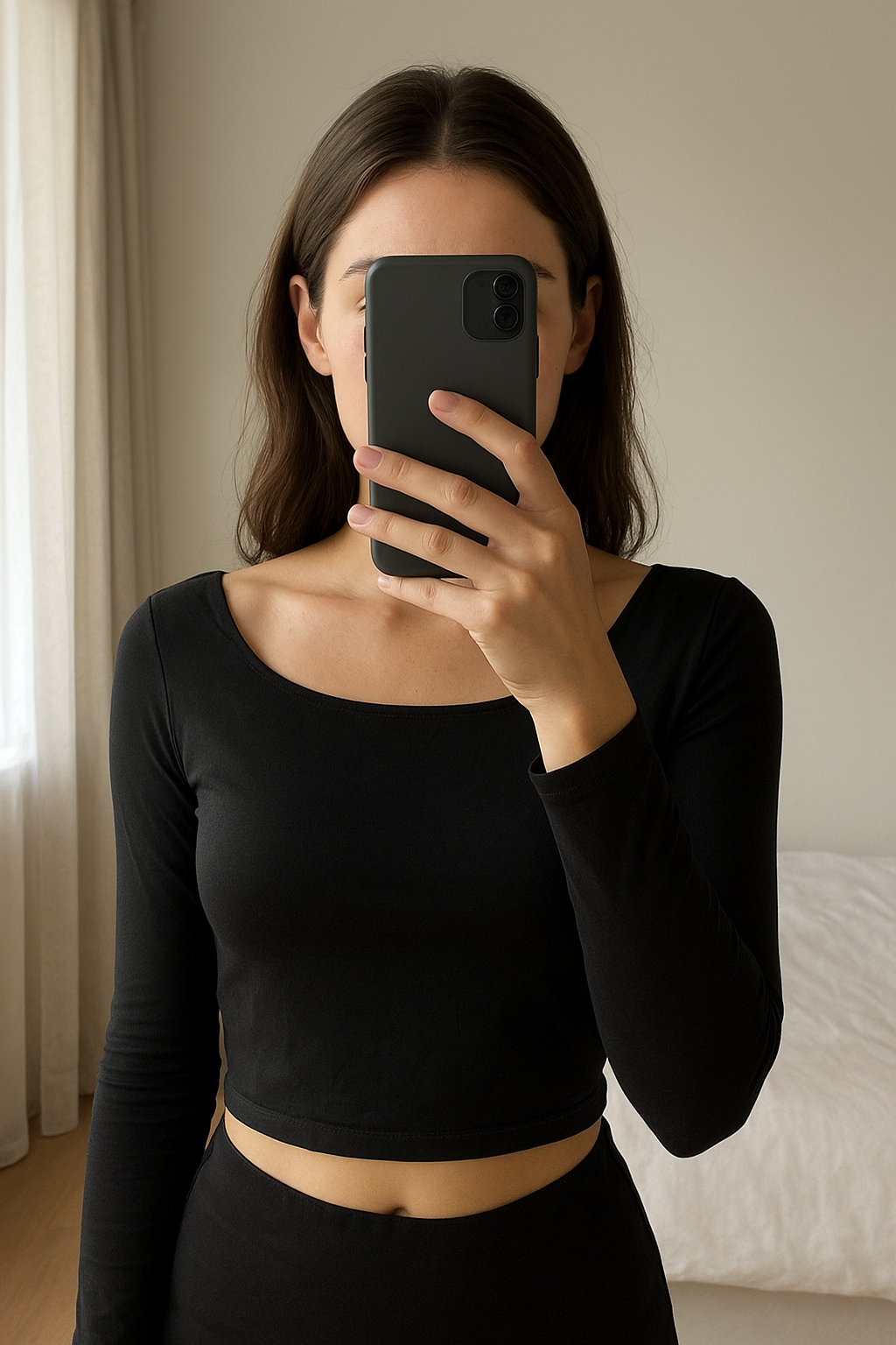 open back top standing straight facing the camera, in a softly lit bedroom setting, with gentle natural light filtering through a window.