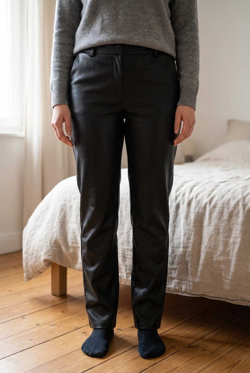 Pantalon Femme en Cuir Kiabi debout, face à la caméra, dans une chambre à la lumière douce, avec une lumière naturelle filtrant par la fenêtre.
