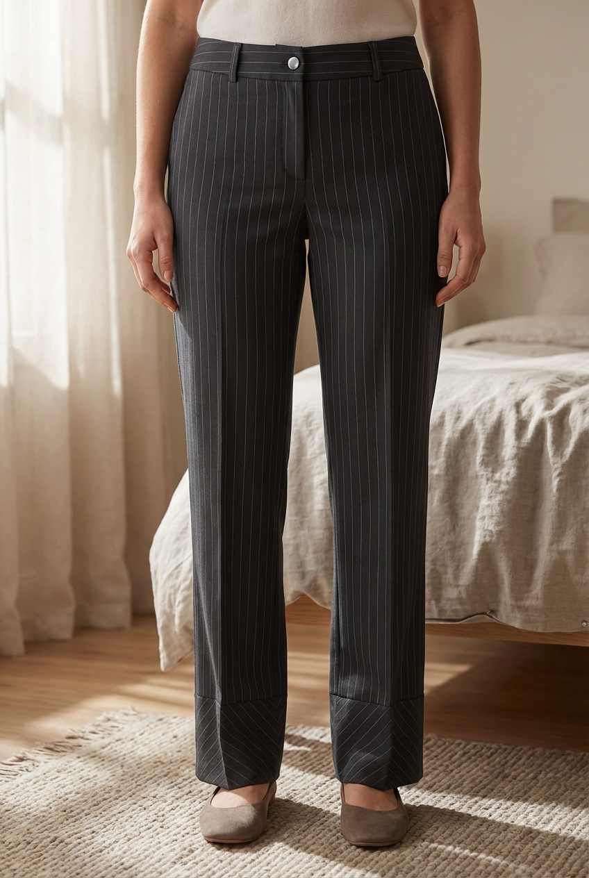 Pantalon tailleur Mexx T40 debout, face à la caméra, dans une chambre à la lumière douce, avec une lumière naturelle filtrant par la fenêtre.