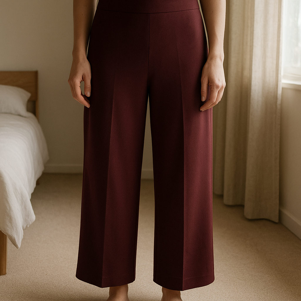 Pantalon Tailleur Zara T36 debout, face à la caméra, dans une chambre à la lumière douce, avec une lumière naturelle filtrant par la fenêtre.