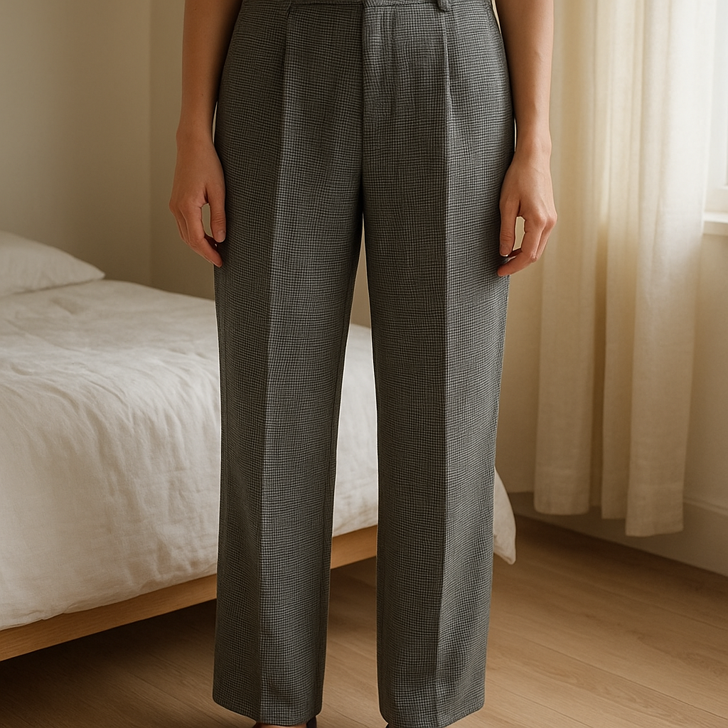Pantalon Zara noir debout, face à la caméra, dans une chambre à la lumière douce, avec une lumière naturelle filtrant par la fenêtre.