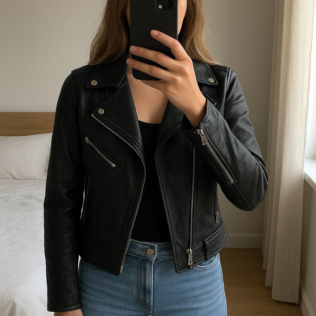 Perfecto en cuir Zara taille L debout, face à la caméra, dans une chambre à la lumière douce, avec une lumière naturelle filtrant par la fenêtre.
