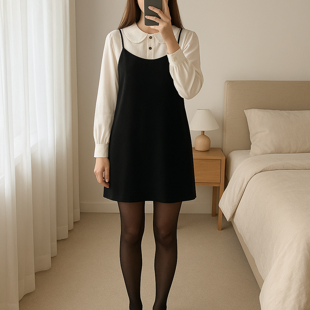 Petite robe en daim debout, face à la caméra, dans une chambre à la lumière douce, avec une lumière naturelle filtrant par la fenêtre.